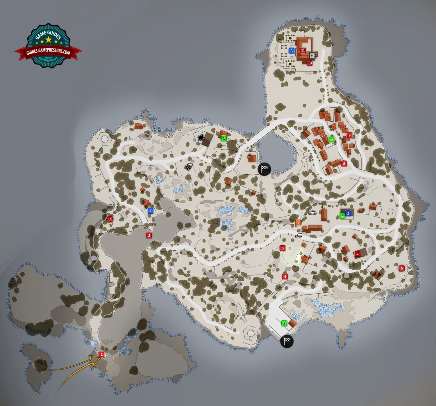 Green color was used to mark the officers - you need to eliminate all of them. Some places marked with red indicate best sniping positions.