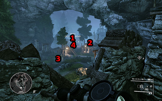 Right after the mission begins, start following Diaz. You will reach the first vantage point from which you will have to clear the nearby village. Firstly take care of the soldier in the distance, behind a car [307m]. Afterwards take down the one tinkering by the crates (wait for the other one to move away from him) [126m]. In the meantime, kill the soldier who at first was standing by the pillars on the right (he will move to the left) [76m]. Wait for the man in the vehicle to be left alone [162m] and in the end kill the guard walking through the village.
