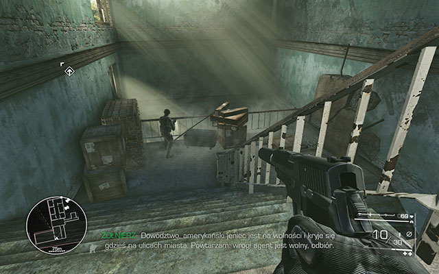 Head back to the previous room and go through the next door - at some point the ceiling will fall down, but luckily it won't do you any harm. Enter the staircase and wait for the soldiers to stop walking and silently eliminate the one standing on the mezzanine.