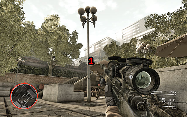 Soldiers will show up on the square - you will have to fight them at a rather small distance, so have a silenced pistol ready in case an enemy runs to the stairs. After clearing the area, as you enter the square, you will be immediately attacked by another sniper from the balcony in the building on the right, second floor from the top [150m].