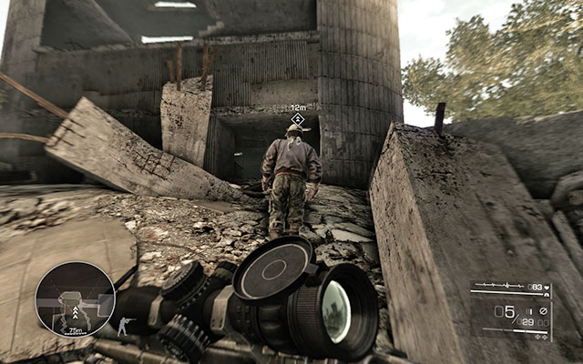 Enter the small room in silently take care of the soldier inside. Carefully head to the stairs which will take you to a ruined building. Eliminate one of the soldiers in the distance [50m] - your partner will kill the other one.