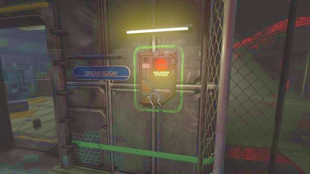 On the wall, right next to the entrance to the room with the "Break Room" sign there's a terminal, which allows you to perform a Data Buffer.
