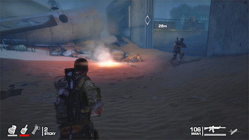 Once you get out of rockets, switch to a standard rifle. Enemies will come running mainly from dunes visible in a distance and a lower floor of the building occupied by you. To eliminate them you might use of course grenades. When needed, you can replenish your supplies with a crate located next to the left stairs.