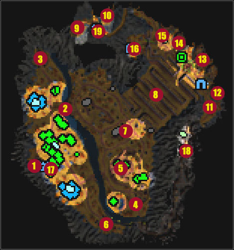 ![]() | After destroying all camps (12,13,14,15) you are being attacked by a very strong group (including Titan). Kill them all and you find the key to the portal. You can see a short cut scene. Now you have to defeat the Shadow general. When you kill him the road to Iron Fields is opened. You may enter the portal (16). Moreover, you got Orc's support against Shadows. New quest is given to you: enter the portal to Iron Fields. Before you do that visit the Westguard. |