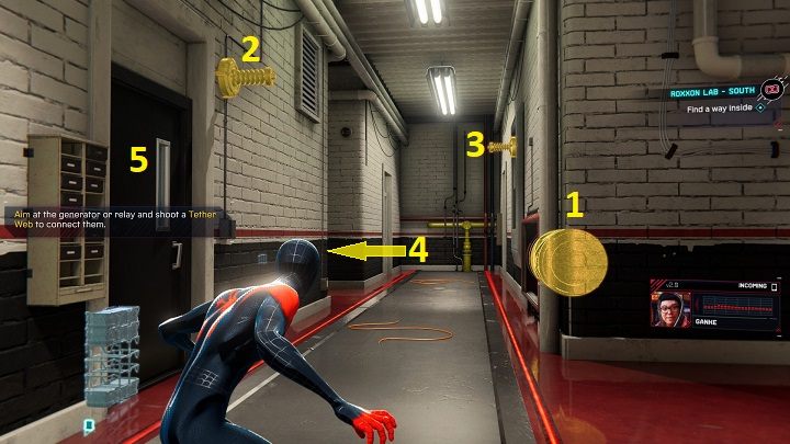 5) The last cache is located in the Roxxon Lab. After you enter the building, turn on the generator (1) by pressing L1 square and using the Web-Shooter, connect it to the node on the wall (2), then make another link between the first node (2), the second one (3) and the third one (4) at the bottom of the stairs. Go back upstairs and walk through the door (5) to open the Underground cache.