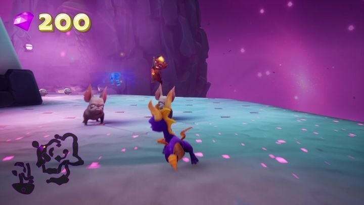 The dragon is located on a rock shelf. You can jump from it to the cavity opposite. You'll find a large group of enemies here. To a large extent these are devils and turtles, so you must be in constant motion to avoid projectiles. After the battle, collect the crystals and enter the teleport. This way it will go to the tunnel at the end of which you will find a firework. It will smash the box you passed at the beginning. From this shelf you can also freely jump on the platform on which there is a level exit.