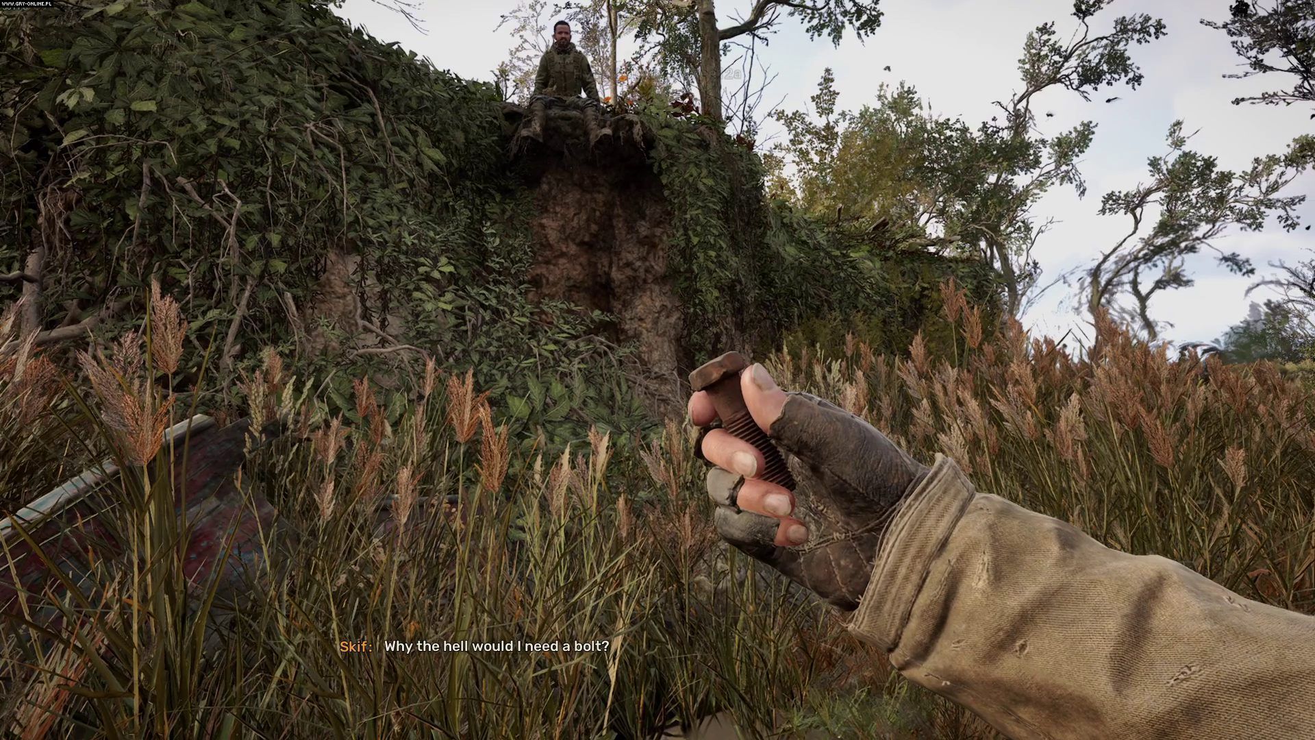 The quest A Tough Awakening will begin right after the game's prologue and title screen. Skif will wake up in the middle of a field, surrounded by dangerous gravitational anomalies. A man named Richter will come to your aid and give you a metal bolt. You can select it from the weapon selection wheel.