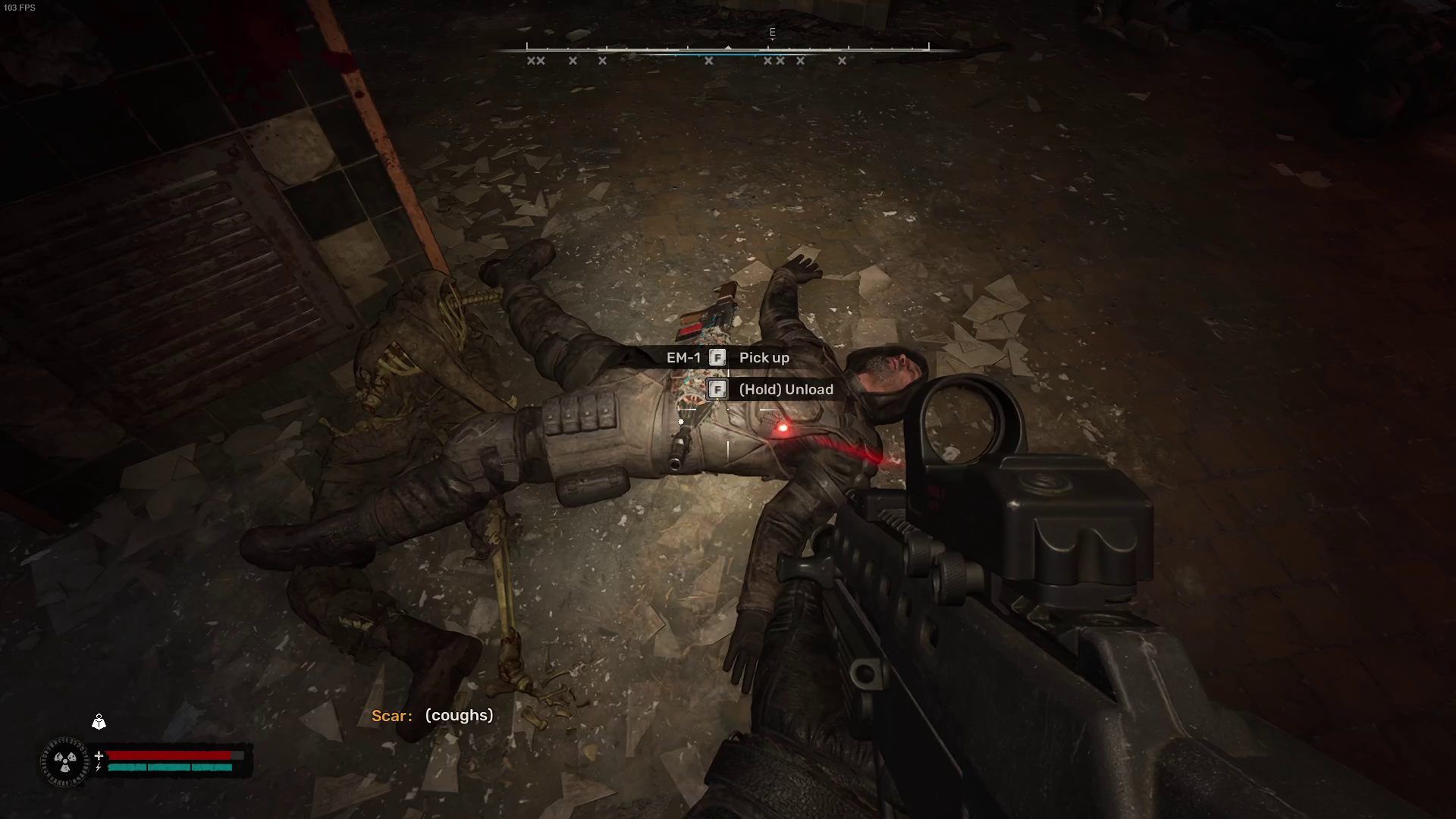 Get the artifact from Scar's body. You can also take his EM-1 rifle. Head to the steel doors on the side of the arena.