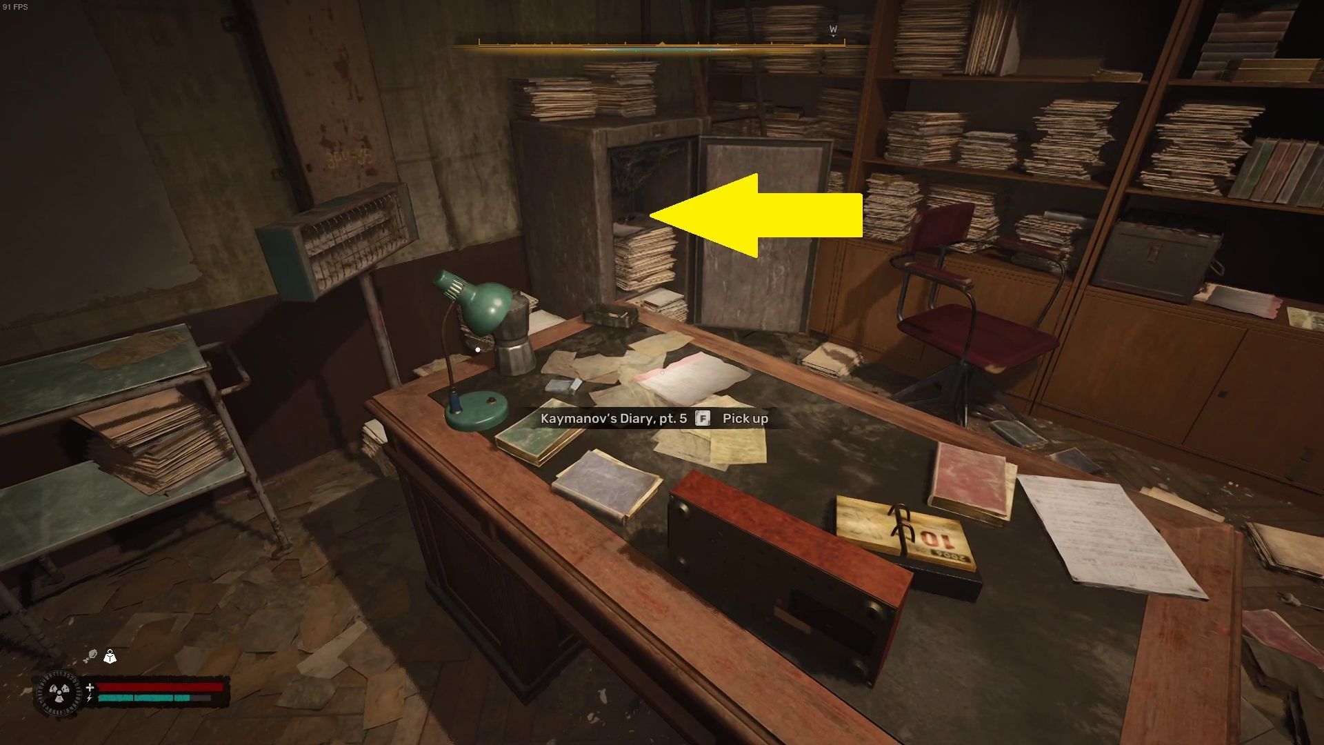 After breaking into Kaymanov's old office, take the documentation from the safe, and then turn on the switch on the table opposite.