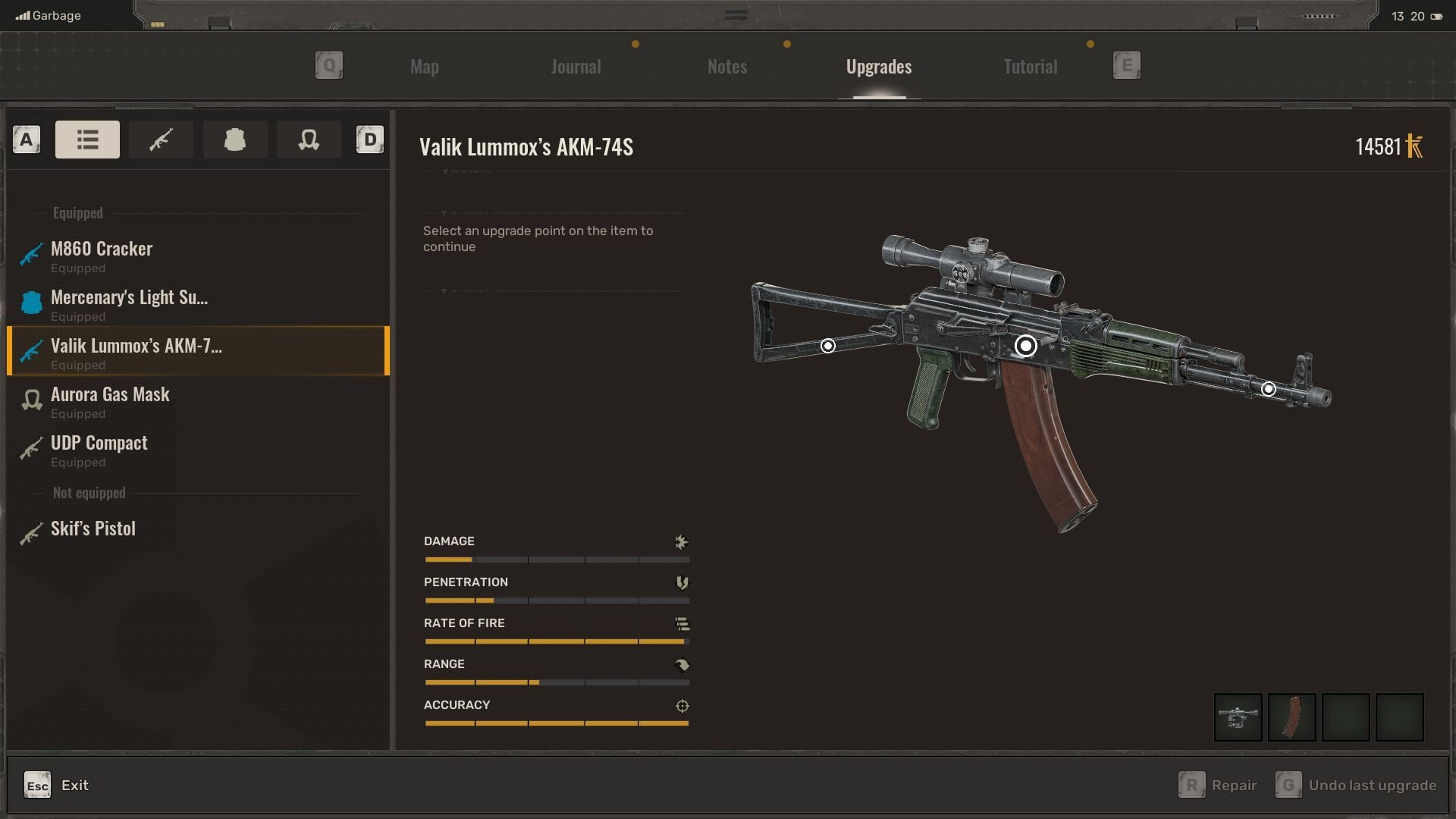 - Comment: Upgrade any weapon or armor. You can do this at technicians marked on the map with a key icon.