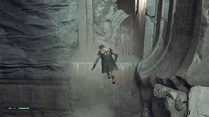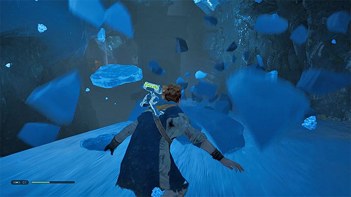 Go straight ahead after defeating your enemies. Destroy a wall with a Force Push and complete a new descent on an icy surface. It is quite difficult stage. In a few places you have to make a perfect jump, run on the wall or catch a rope. The hero will finally reach the Ice Caves. Right next to the place where you finished the descent there is a meditation point.