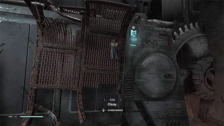 Go back a bit and follow the side route hidden behind the cables. In the new location, jump to the lower level and approach the workbench shown in the picture. This unlocks a new ability for BD-1 - Overcharge. You can connect to selected panels to turn them on or off.