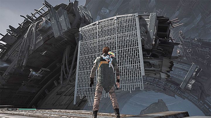 In order to complete the main story, you need to be interested only in the lower levels of the tower, and specifically reach the workshop table shown in the picture. Interacting with it will unlock a very useful improvement for BD-1 - a Scomp Link. From now on, the droid can hack selected terminals and locked chests. This guarantees access to new passages and to new loot from locked chests.