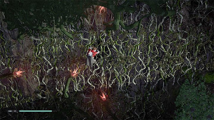 A meditation spot is on the shore. Swim further and get to the area with two big spiders. Fighting them is optional. Lung Plants, which can catapult the main character, are here. However, they don't deal any damage so they can be treated as a springboard. The first plant of this type is near the area with spiders (the picture above).