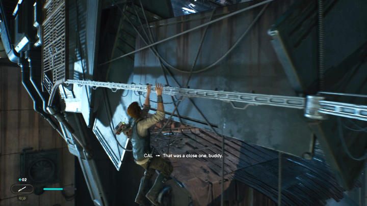 Use Force Pull, jump over the bars and continue to the right. Watch a cut-scene.
