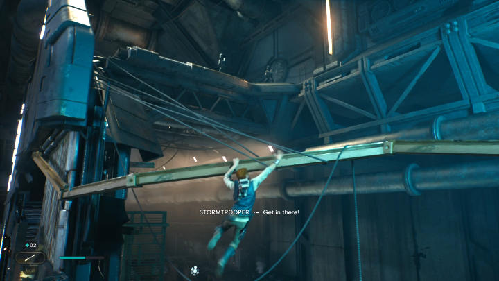 Jump up and grab onto a metal beam, then move to the right - you don't have to be afraid of blaster shots fired by guards.