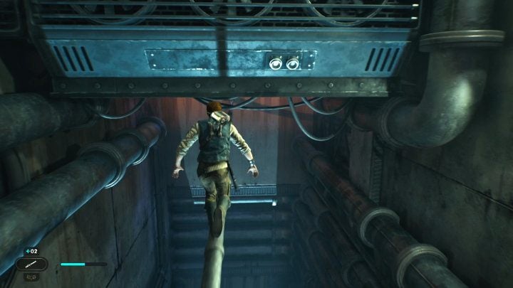 Cut the rope, then use Force Pull on it to jump to the other side, grabbing the bars. Climb up. Moving forward, unlock another shortcut.