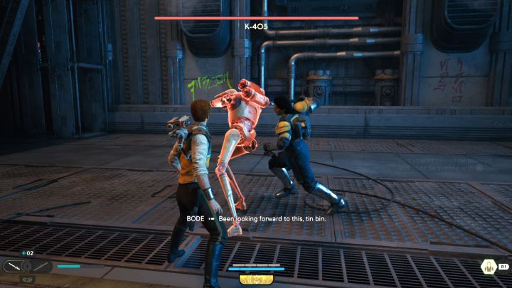 After K-405 loses almost all of its health bar, the finishing attack will automatically be activated - Cal and Bode deal with the droid together.
