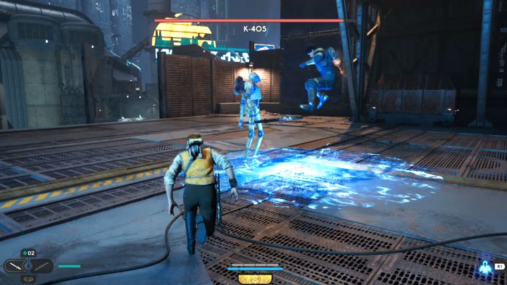 The K-405 is the first enemy in the game to have a long health bar shown at the top of the screen, but you should treat the droid more like a mini-boss and part of a tutorial.