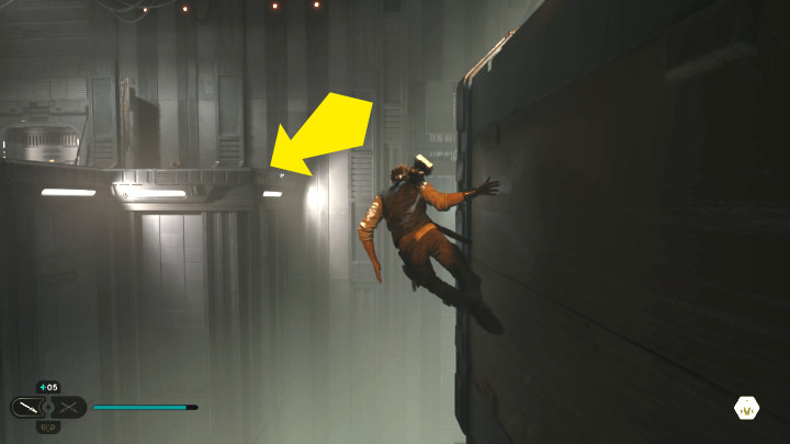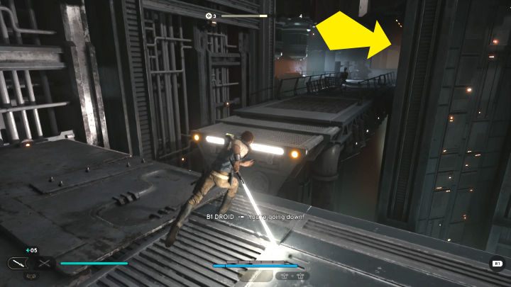 Moving on, you will eventually reach the place shown in the screenshot above (the corridor on the right leads to a shortcut to the meditation point). Jump over the bars, and from there, breaking through the force field, jump into the room with several enemies.