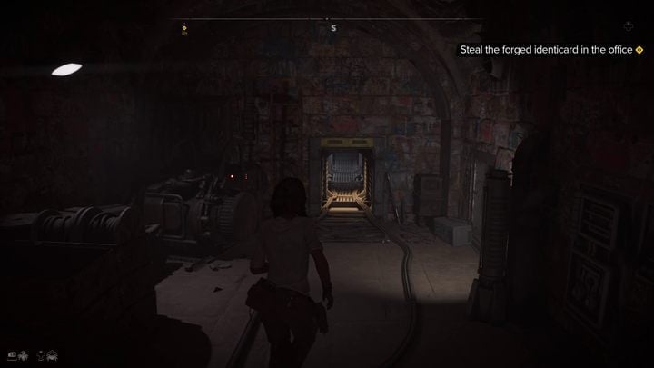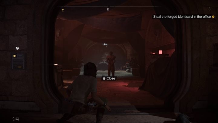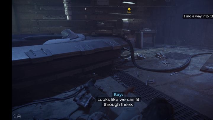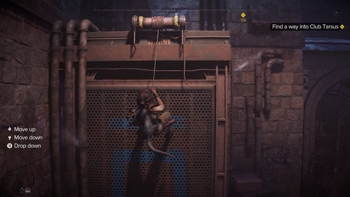 Follow the marker. The bouncers standing in front of the entrance will refuse you entry, so you will have to enter by trickery. Turn into the street to the left of the entrance and then find a garage with a slightly open gate. You will recognize the correct place by the cables leading to the room and the speeder parked inside. You will pass under the gate by crouching.