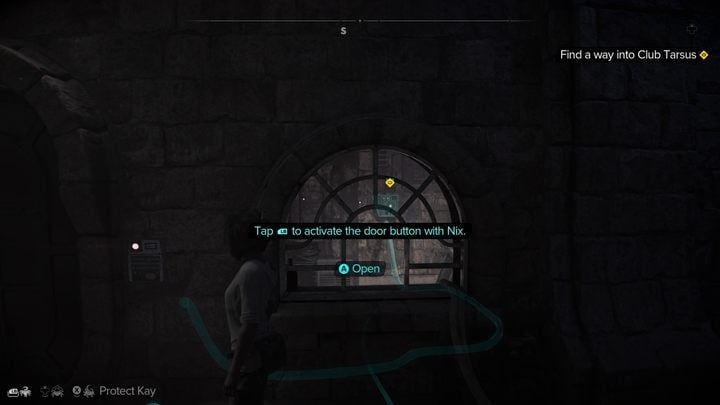 By holding down the up button on the controller's D-pad you can momentarily move the mission marker from the compass to the space around Kay. This will help you navigate the immediate surroundings.