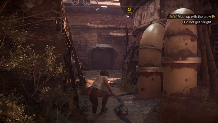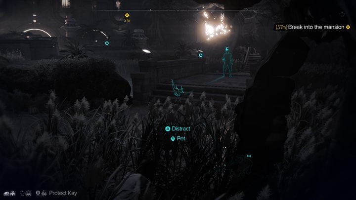 In the courtyard, the game will present you with stealth and takedown mechanics. Use tall grass, whistling, and Nix to lure individual guards and eliminate them.
