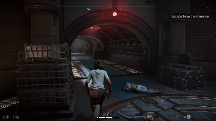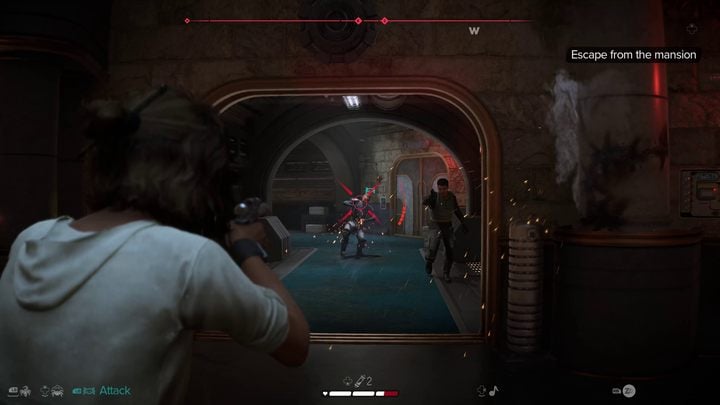 Go inside the mansion. When you reach the red force field blocking the passage, activate Nix's senses, which will highlight electrical wires. If you follow their trail, you will find a small room where you can deactivate the barrier.