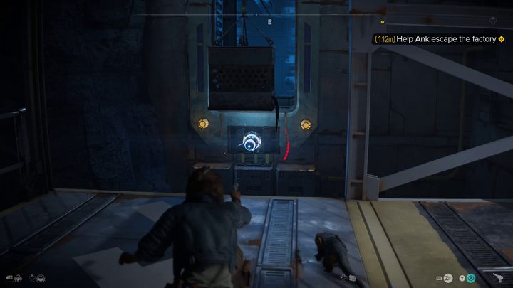 Follow the mission marker. To get to the platform full of enemies, you will have to activate the cart. Shoot the capacitor with ion missiles, then grab onto one of the boxes that will pass by you. The edge you can grab onto is highlighted in yellow.