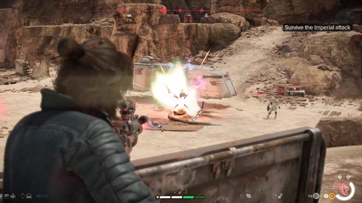 The Empire has found you - you must survive until help arrives. Get behind cover as quickly as possible and shoot at the gradually arriving stormtroopers. Use explosive barrels and grenades to thin their ranks. You can also send Nix to fetch weapons dropped by certain stormtroopers without having to leave the cover. Also remember to use adrenaline rush - it will be especially useful against enemies with shields.