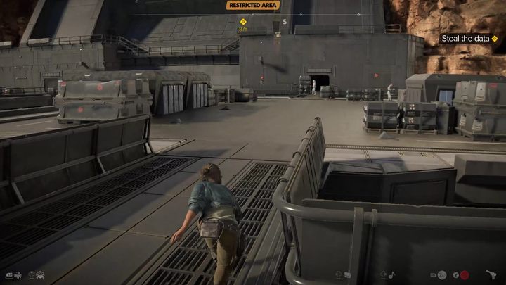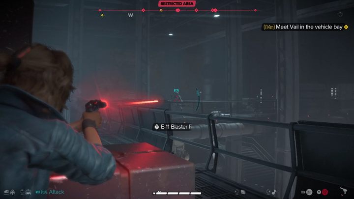 Go along the wall and turn right, crossing the footbridge to the landing pad. There is one guard here and a patrolling stormtrooper - take care of them while hiding behind cover.