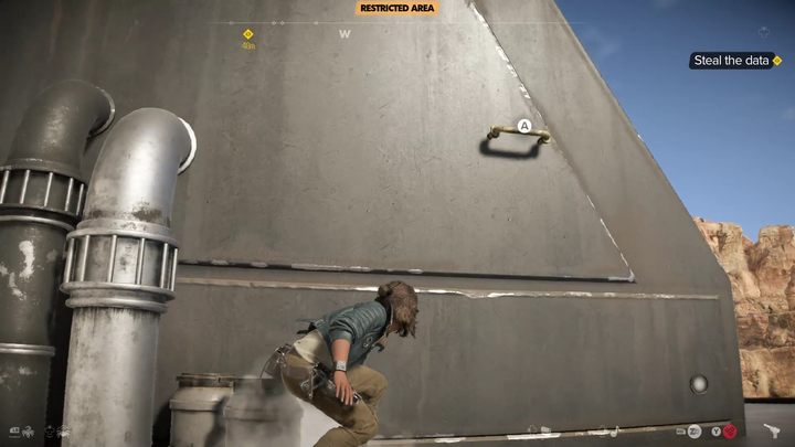 After passing through the landing pad, do not go inside the fort - use the grappling hook to climb up the wall. Go to the other side of the fort where you will find poles that you can use to climb even higher.