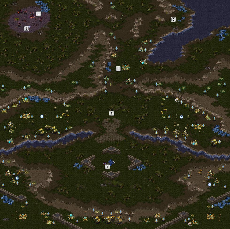 Your base is located in the green valley in the top left corner (1). There is only one land way to it, but the protoss often perform landings on the outskirts of the place. You need two Zerglings and Hydralisks groups tops to defend the base. Focus on expanding your air force and research all flyer enhancements. Every protoss base consists of many Reavers, which can pretty much decimate your army. The enemy introduces two new units to combat: Arbiter and Carrier. The former is a kind of a counterpart of a Queen or Defiler. It has several special abilities, including the Stasis field that holds your units in place. The latter has no armaments of its own but carrier a number of Interceptors, which are small fighters. It is the biggest threat the protoss pose and you should eliminate it in the first place.