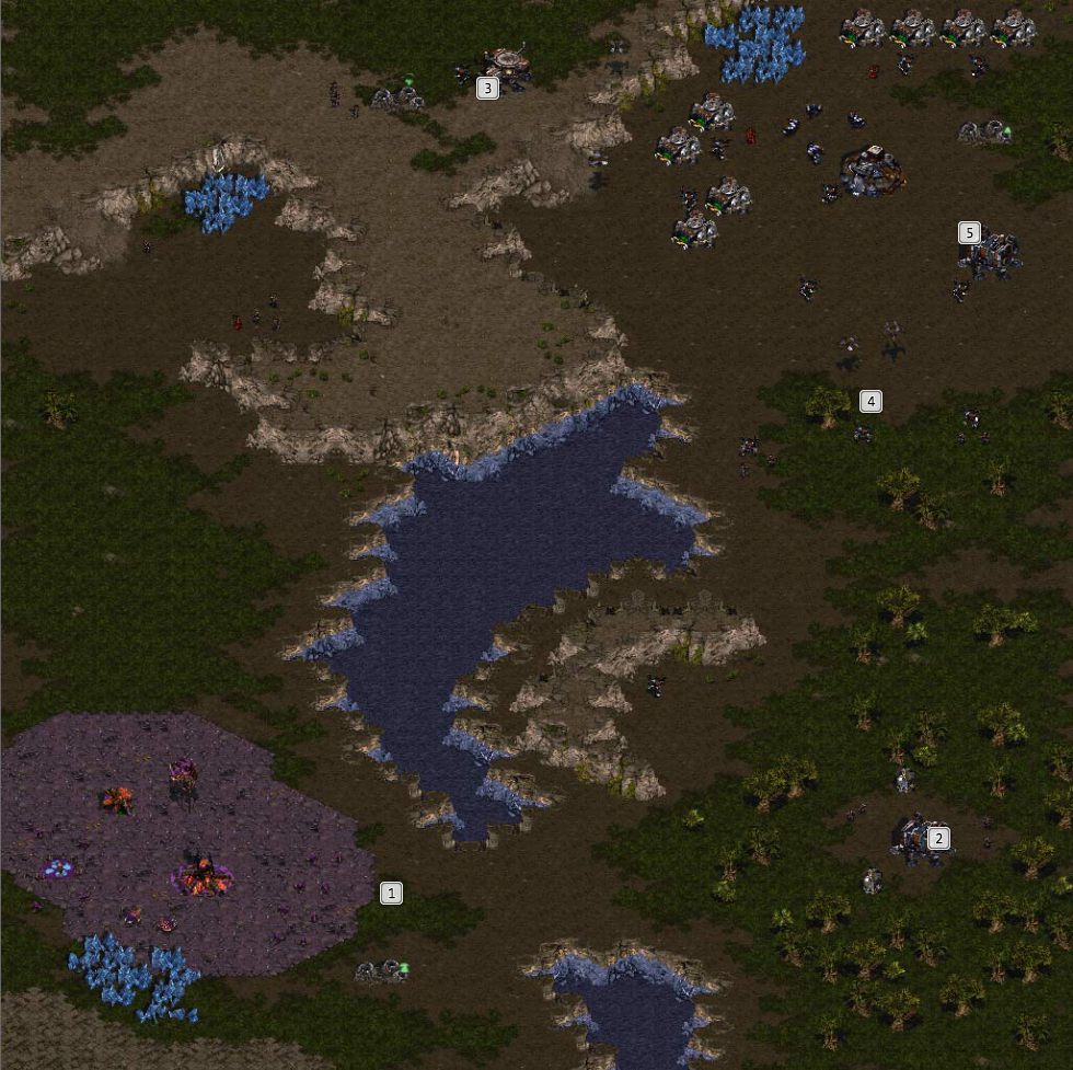 Create a group of Zerglings and destroy the Barracks in the south (2). Now, go back to the base, replenish your forces, and attack the enemy Starport from the left side (3). It is located on the northern hill. Then, reinforce your army, create a team of Hydralisks, and assault the main base in the top right corner of the map (4). On your way there, you'll encounter small enemy groups. If you have problems with commanding and selecting targets, it is a good idea to choose a Zergling group and give them the Attack Move order, which has the units attack an area of your choosing instead of a specific building/unit. In this way, your troops will attack everyone on their way. Meanwhile, take Hydralisks and select their targets, starting with Firebats and Goliaths. Having destroyed the defenders on the foreground, attack the Barracks (5). This will stop the enemy from creating new units. Then, destroy the Command Center and the remainder of enemy forces.