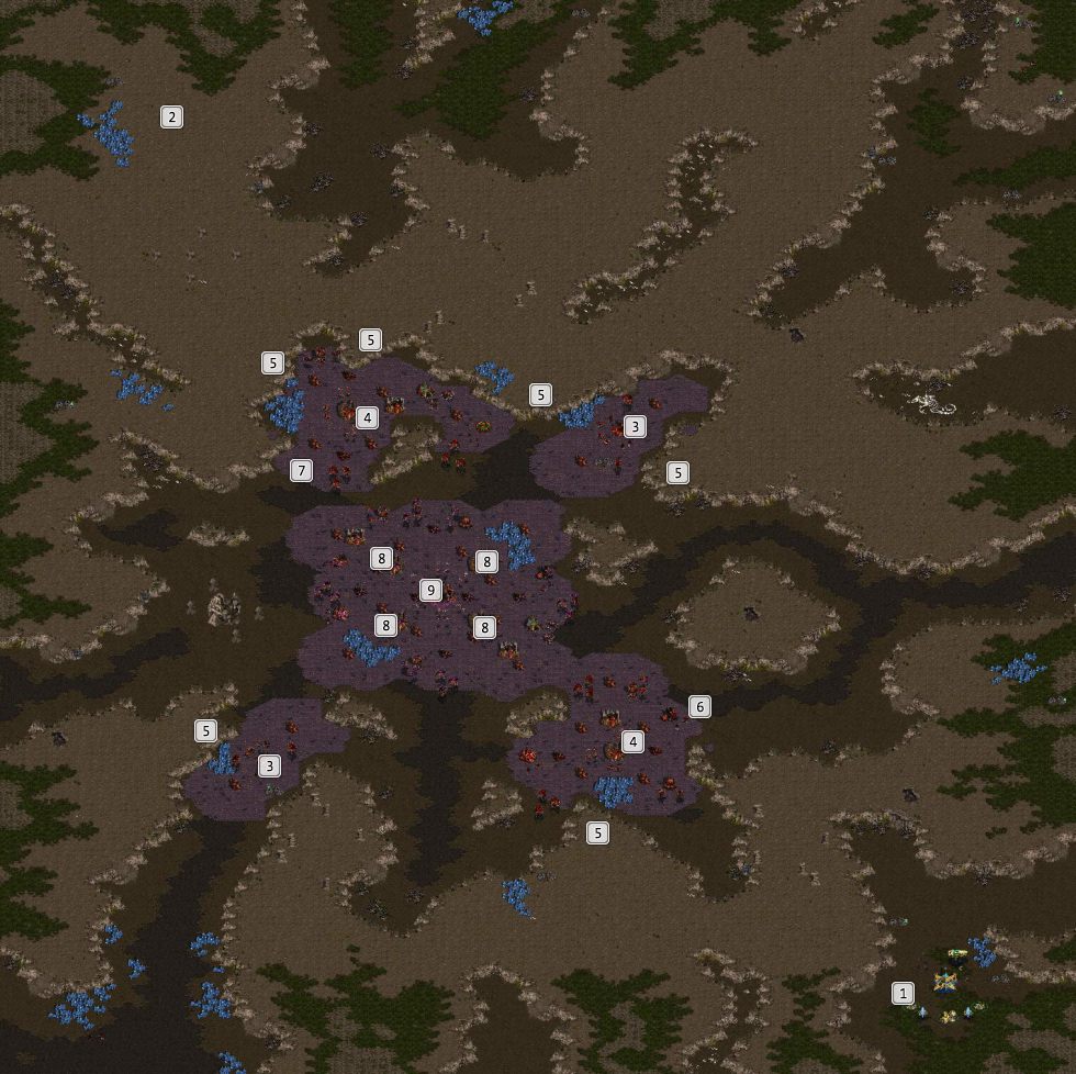 The first 30 minutes should be spent on digging in and getting as much resources as possible. The red Zerg will attack you most often, with everything he's got. Most often, it will be a land attack: Mutalisks and Guardians or a Zerg Queen or Defiler. First, destroy both mining operations (3), which have minimal defenses. You can reach all places without transporters. Remember that the enemy will dispatch Drones to rebuild the lost Hatcheries. Leave small units there. Then get ready to destroy the main production hubs of the Zerg (4). These are strong bases defended by many units. You can use the following strategies: