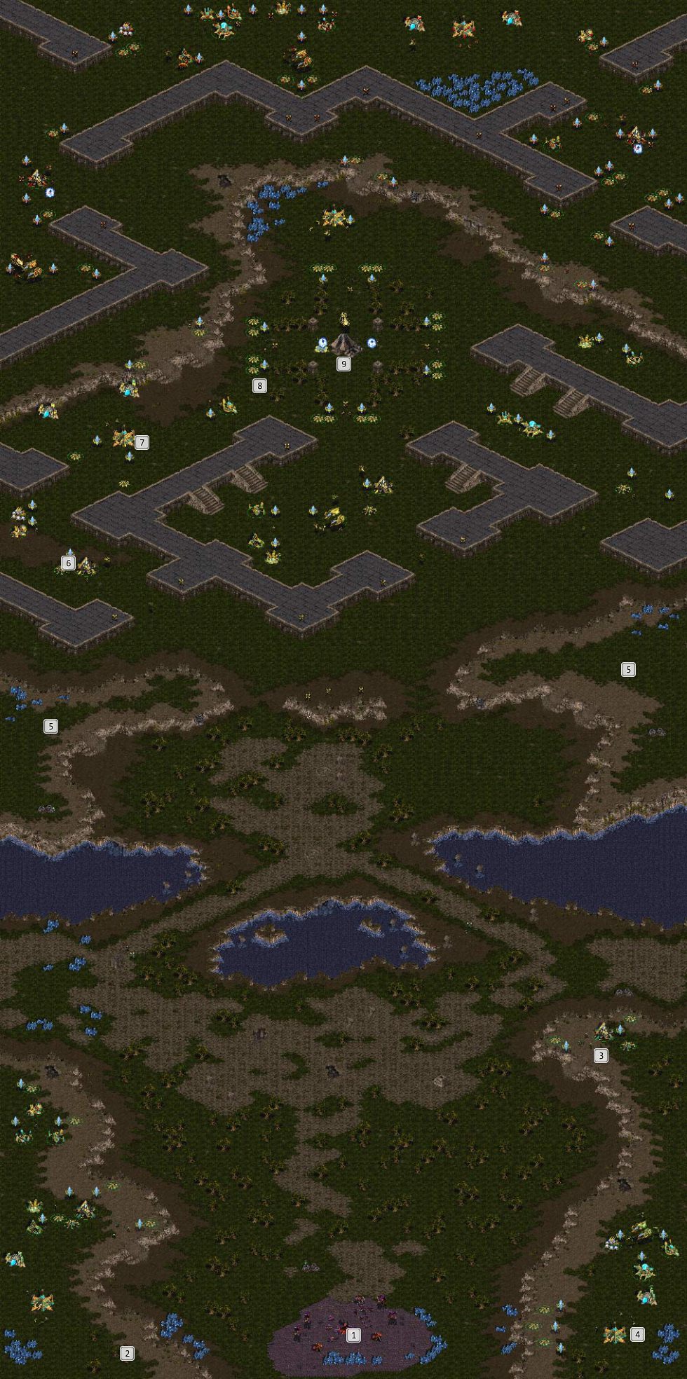 Your starting position is located at the bottom edge of the map (1). It is situated between two small bases. From there, the enemy will be often sending land forces. To the north, around the temple area, there is a vast base of the Yellow protoss. This one will be sending a Carrier and several (3-5) Scouts every now and then. At the beginning, create a team of Hydralisks - it will deal with most of the threats. Ultimately, you need to create large flyer squads, and to do so, you need big amounts of gas. The last army, the Red protoss at the north edge of the map, won't be attacking you for the majority of time.