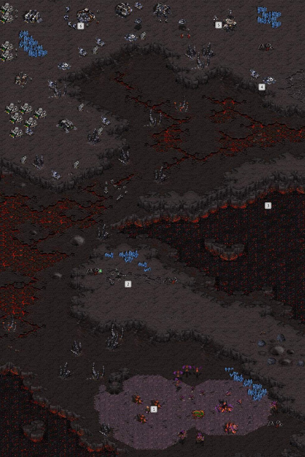 Destroy the production buildings - Starport, Barracks, Factory, Command Center, one by one (6). Turrets are a threat to small groups of Mutalisks so it would be best if you infantry got rid of this danger. On the other hand, two teams of Mutalisks are capable of quickly destroying Turrets and start wreaking havoc in the enemy base. It's important to eliminate enemy workers and destroying the southern part of the base. The enemy often rebuilds the destroyed buildings in new places. The terrans also call for reinforcements from every corner of the map to fight you. Even if this attack fails, it's a good idea to quickly assemble another strike team, even a one consisting only of Zergling squads. The key is not to give the enemy time to retrain the workers and rebuild the Barracks and Factory.