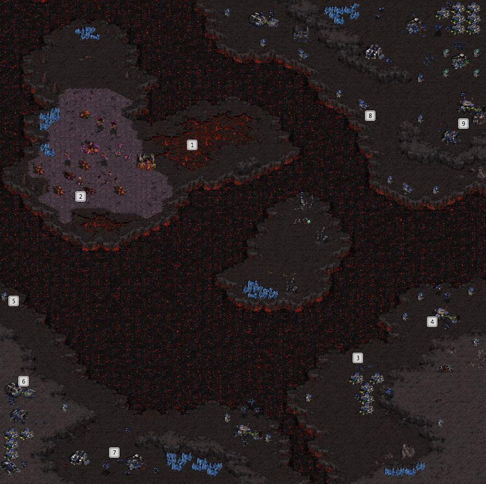 A risky plan looks similarly but focuses on the Raynor's base right away. Gather your forces in the top right corner of the map, below the enemy base. Destroy the first Turret and deploy your army above, between the Barracks and Starport (9). Divide your army into two groups: one that defend against the terrans, the other (preferably consisting of Zerglings) attacking the Command Center. Use the Ensnare ability (Queen) on a hostile group, which will make them easier to defeat. Have Mutalisks take the brunt of destroying hostile land forces.