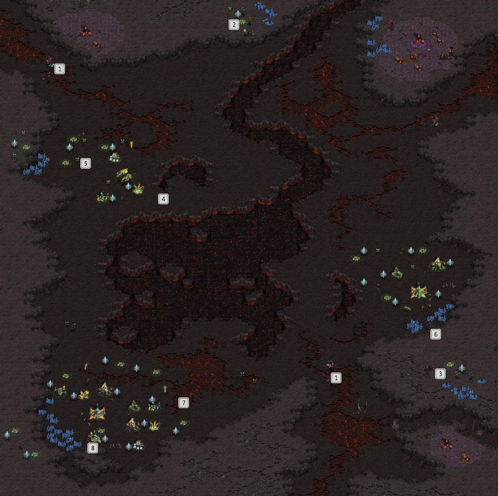 Start from expanding your base and building basic technology build at the same time to enable the training of Zerglings and Hydralisks. It's enough to have 1-2 Overlords, 6 Hydralisks and Zerglings in each location (1). Such a garrison should be enough for most of the time. There are two extra spots for expansion in the map - the northern one can be taken over in the first few minutes of the game (2,3). It is guarded by two Dragoons and Scouts as well as a Turret. At the moment, you need the Vespene gas for producing advanced units rather than minerals. In this mission, you will be relying on air force again. However, at some points, you will need two teams of Zerglings and Hydralisks.