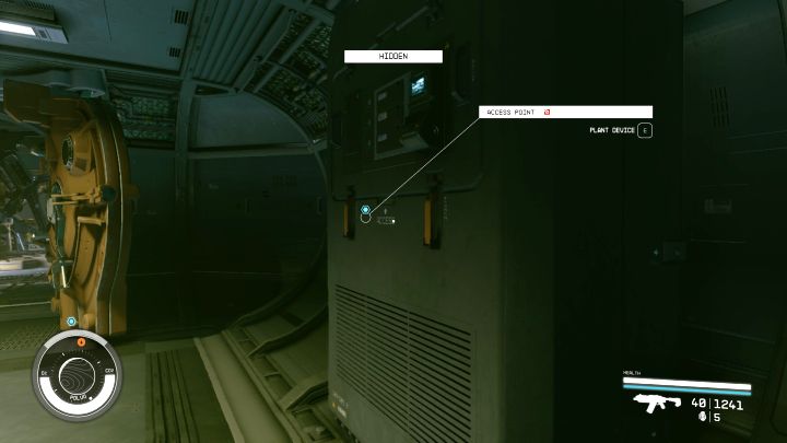 - Once inside, look for a ladder which will take you to the right deck. Crouch and check if you're in stealth mode. If you are, the installation of the ARC Device will be possible (Access Point marked with a blue icon - screenshot). Watch out for a guard - wait for him to leave the post or turn the other side.