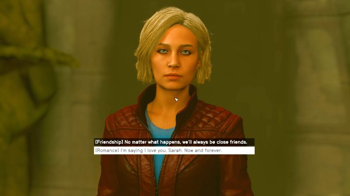 - While traveling with Sarah, she may react positively to your actions - in the upper right corner, you may see information that she liked or loved your answer or reaction in the quest. She will also respond very positively to being allowed to take the initiative in a conversation and speak on behalf of the protagonist.
