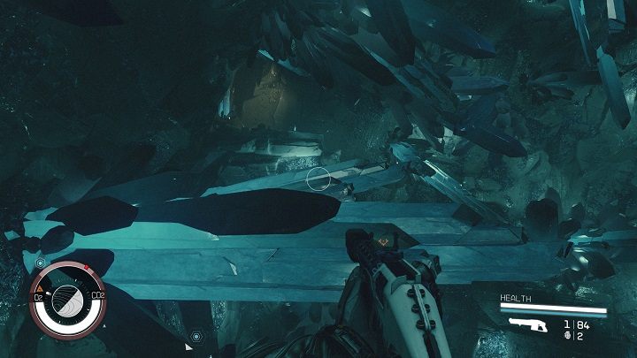 - Enter the elevator and take it down. There, climb the stairs and then jump on the large blue crystals sticking out of the walls. You will reach a hole that leads to doors being the return path - you, however, go the other way and keep going down the stairs.