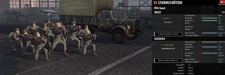 The main troops on the front line are the Schutzen units. They count as many as 13 soldiers in the unit, including two armed troops with MG 42 machine guns that have a range of 750 meters. Additionally, the unit is equipped with anti-tank grenades. This is an effective weapon from a very short distance, so hide your troops in forests or buildings to attack enemy tanks with surprise. One of the best infantry units on the German side are so-called Sturmschutzen. This 13-person squad is equipped with the best infantry weapon, the MP 44. This is a great, fast-fire automatic weapon with a range of 300 meters that can nail enemy troops pretty well. In phase A, you can allocate between 2 (veterans) and 6 (recruits) troops on the battlefield, and in phase C between 6 (veterans) and 18 (recruits). It is worth choosing cheaper alternatives and support them with leader units, so you may provide them with more experience.