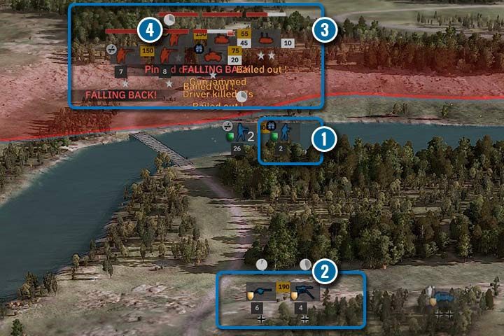 In this picture you can see how easy it is to design an effective bridge defense. Here you can see some important information: the advanced scout (1) provides valuable information for the anti-tank cannons and machine guns (2). The enemy's strike team was pinned down by artillery fire (3). The stress bar, also known as morale, is filled and forced some units to flee (4).