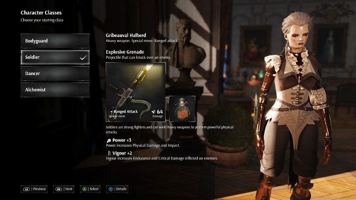 - Soldier: wields heavy weapons and leads with powerful physical attacks. As a Soldier, you wield a halberd from the beginning of the game - its characteristic trait is its long range, which makes combat easier. Soldiers' unique skill is the Explosive Grenade, which can topple its target.
