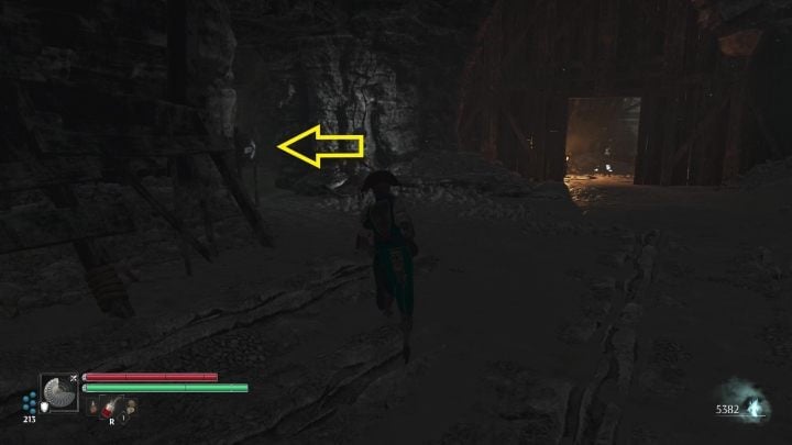 On the left side of the square is a building. From its floor you will get to platforms hanging along the rock wall. You can climb there from the warehouse or by walking up the prominence.