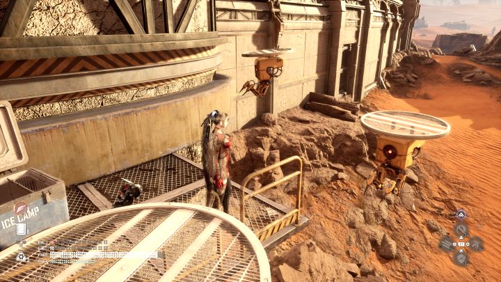 - Travel south-west from the Great Desert landing pad. In the area indicated by the screenshot, EVE can grab a vertically-moving bar and then jump to levitating drones.