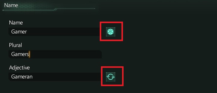 Now you have to come up with a name for your race. You can use the generator to help you (marked in the screenshot). Then you will have to give the plural equivalent of your species. Finally, you have to press the other marked button presented in the picture. This will automatically create the adjective. Think carefully about the name, as it will remain throughout the entire campaign.