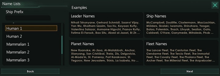 The next section concerns names of different objects in your empire. The list provides you with a wide range of names. Even if you play as Arthpoids, you can choose human names. Draw your attention to the fact that you can use prefixes with names of your space ships - this should help you distinguish them from one another.