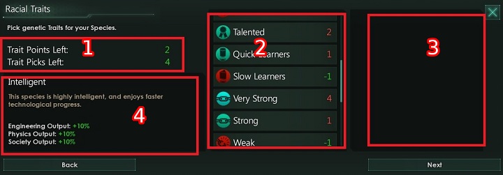 The presented picture shows traits that can be associated with your species. Window two presents traits that you can choose from. Their prices in trait points are visible next to their names. Window 4 is a detailed description of a trait. Window 3 shows traits that have been chosen from the list.
